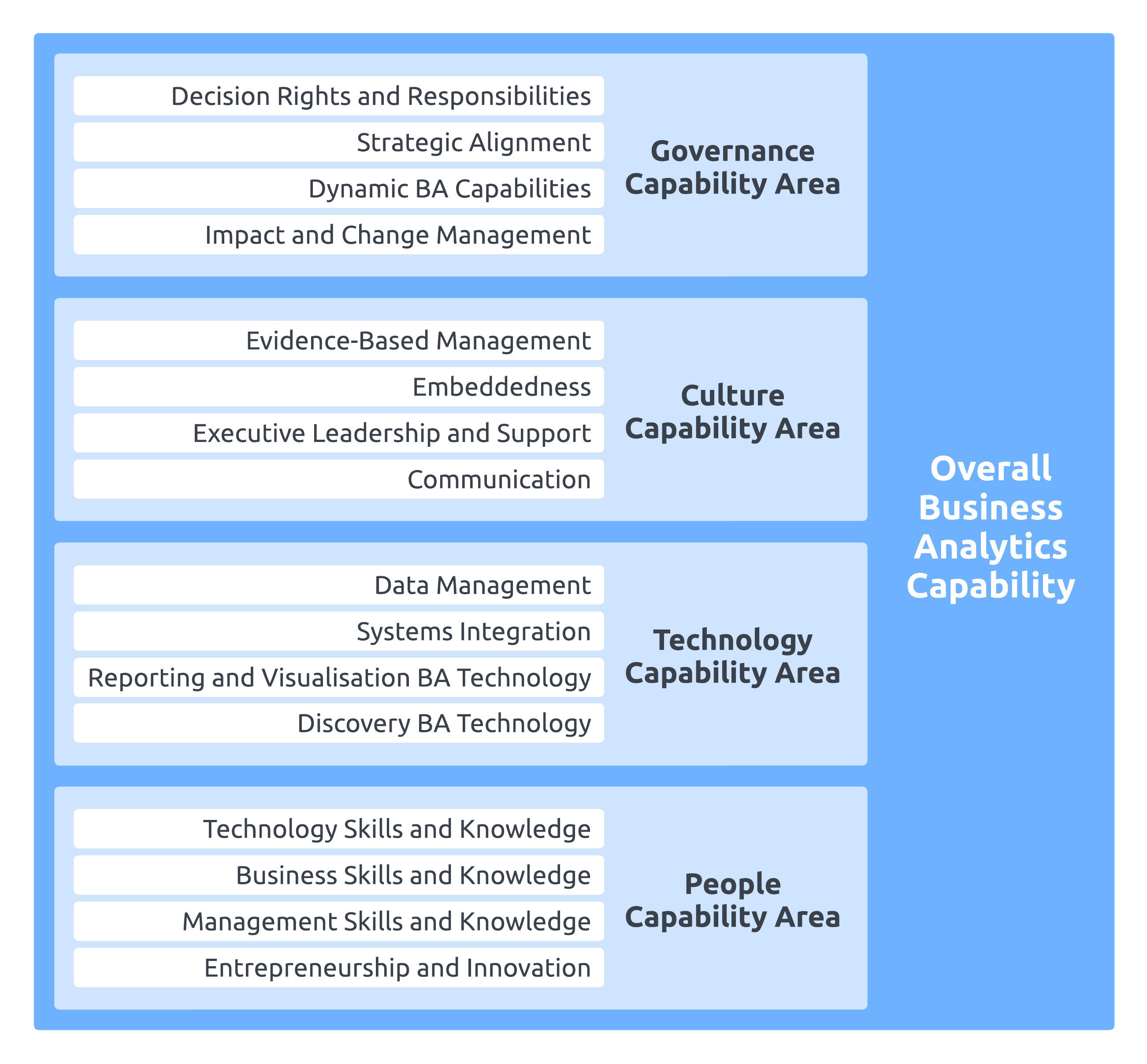 Pictured below is what is known as the Business Analytics Capability Framework (BACF). It shows that the overall business analytics capability of an organisation is made up of 16 lower level business analytics capabilities that are grouped into four different capability areas.